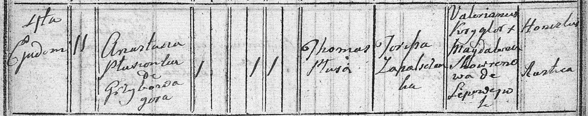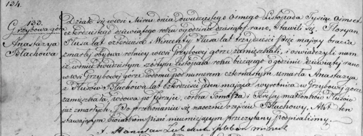 Działo się wWsi Mircu dnia dwudziestego ósmego Listopada Tysiąc ośmset czterdziestego dziewiątego roku o godzinie dziesiątej rano. Stawili się Floryan Płusa lat czterdzieści i Wincenty Płusa lat trzydzieści pięć mający bracia zmarłej obydwa rolnicy wWsi Grzybowej górze zamieszkali, i oświadczyli nam iż wdniu dwudziestym szóstym listopada roku bieżącego o godzinie dziewiątej rano wWsi Grzybowej górze wdomu pod numerem czternastym umarła Anastazya z Płusów Błachowa lat czterdzieści jeden mająca wyrobnica w Grzybowej górze zamieszkała, wdowa po Jędrzeju, córka Tomasza i Teresy małżonków Płusów już zmarłych. Po przekonaniu się naocznie o zejściu Błachowej, Akt ten stawającym świadkom pisać nieumiejącym przeczytany podpisaliśmy.