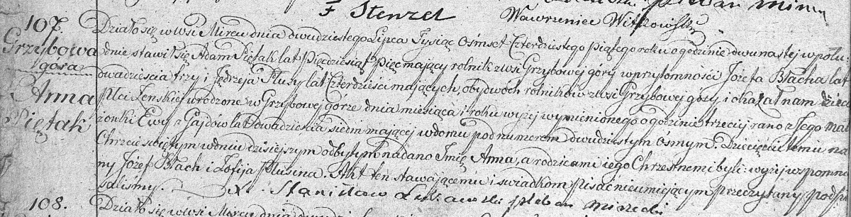 Działo się wwsi Mircu dnia dwudziestego Lipca Tysiąc Ośmset Czterdziestego Piątego roku o godzinie dwunastej w południe stawił się Adam Piętak lat pięćdziesiąt pięć mający rolnik zwsi Grzybowej góry wprzytomności Józefa Błacha lat dwadzieścia trzy i Jędrzeja Płusy lat czterdzieści mających, obydwóch rolników zwsi Grzybowej góry i okazał nam dziecię Płci Zeńskiej urodzone w Grzybowej górze dnia miesiąca i roku wyżej wymienionego o godzinie trzeciej rano z jego małżonki Ewy z Gajdów lat dwadzieścia siedm mającej wdomu pod numerem dwudziestym ósmym. Dziecięciu temu na Chrzcie świętym w dniu dzisiejszym odbytym nadano imię Anna a rodzicami iego Chrzestnemi byli: wyżej wspomniany Jóżef Błach i Zofija Płusina. Akt ten stawającemu i świadkom pisać nieumiejącym przeczytany podpisaliśmy.