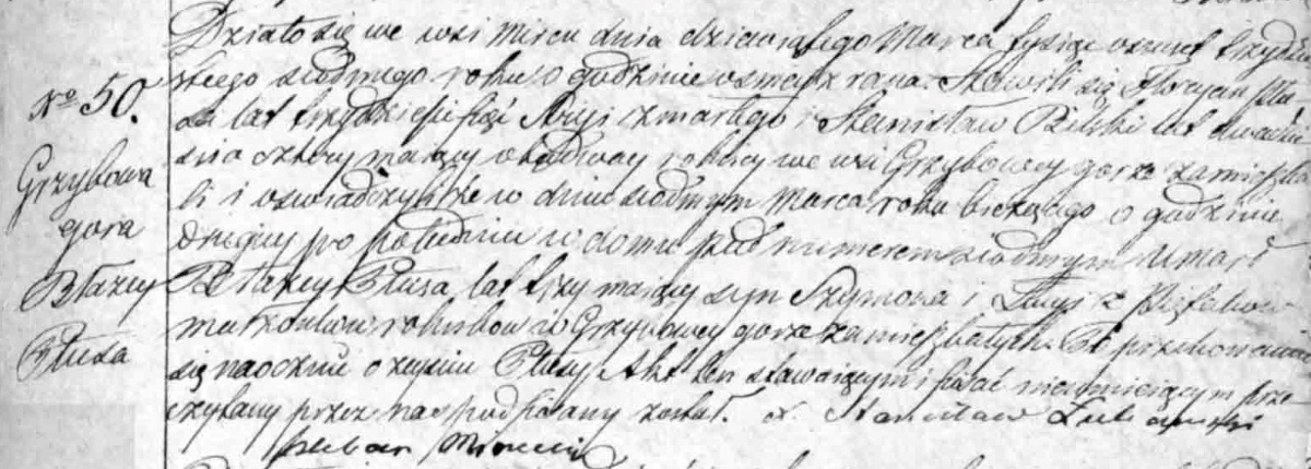Działo się we wsi Mircu dnia dziewiątego Marca tysiąc ośmset trzydziestego siódmego roku o godzinie ósmey z rana. Stawili się Floryan Płusa lat trzydzieści pięć Styi zmarłego i Stanisław Bilski lat dwadzieścia cztery maiący obedway rolnicy we wsi Grzybowey Górze zamieszkali i oświadczyli że w dniu siódmym Marca roku bieżącego o godzinie drugiey po południu w domu pod numerem siódmym umarł Błażey Płusa, lat trzy maiący syn Szymona i Łucyi z Piętaków małżonków rolników w Grzybowey Górze zamieszkałych. Po przekonaniu się naocznie o zeyściu Płusy Akt ten stawaiącym i pisać nieumieiącym przeczytany przez nas podpisany został.