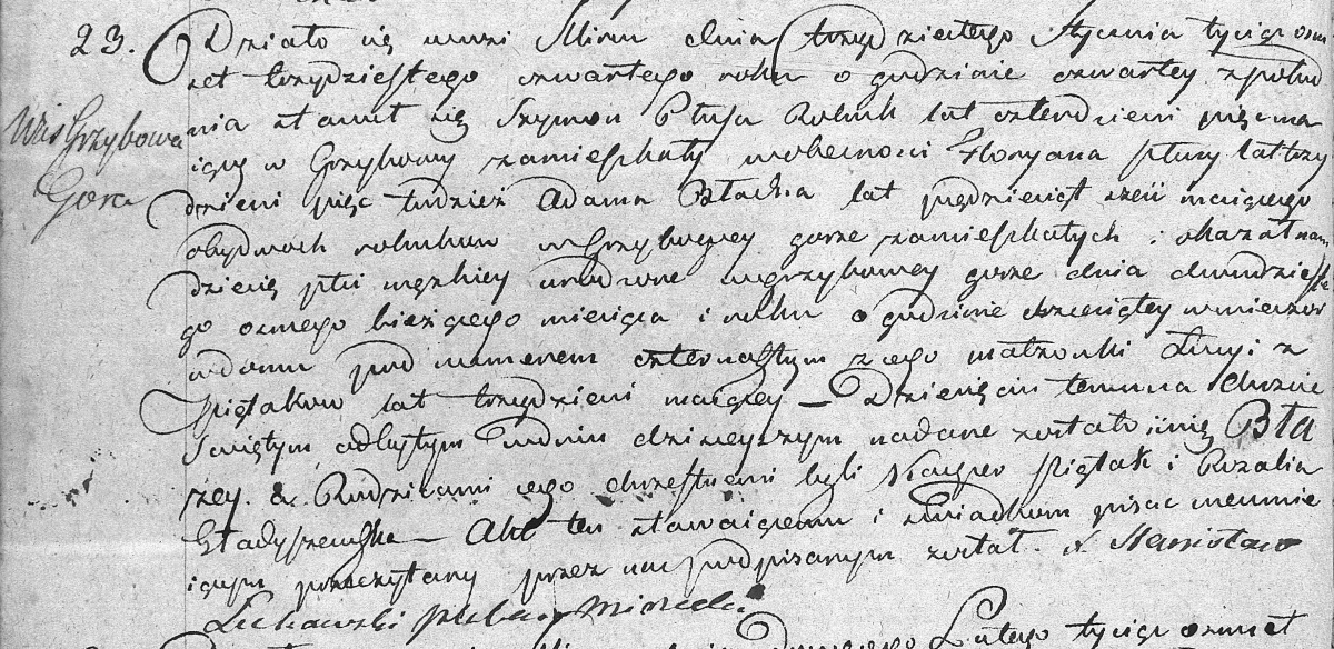 Działo się wwsi Mircu dnia trzydziestego Stycznia tysiąc ośmset trzydziestego czwartego roku o godzinie czwartej zpołudnia stawił się Szymon Płusa Rolnik lat czterdzieści pięć maiący w Grzybowey zamieszkały wobecności Floryana Płusy lat trzydzieści pięć tudzież Adama Błacha lat pięćdziesiąt sześć maiącego obydwóch rolników w Grzybowey górze zamieszkałych i okazał nam dziecię płci męskiej urodzone w Grzybowey górze dnia dwudziestemo ósmego bieżącego miesiąca o godzinie dziesiątey wwieczór wdomu pod numerem czternastym z iego małżonki Łucyi z Piętaków lat trzydzieści maiącey. Dziecięciu temu na Chrzcie Świętym odbytym wdniu dzisiejszym nadane zostało imię Błażey a Rodzicami jego chrzestnemi byli Kacper Piętak i Rozalia Gładyszewska. Akt ten stawaiącemu i świadkom pisać nieumieiącym przeczytany przez nas podpisany został.