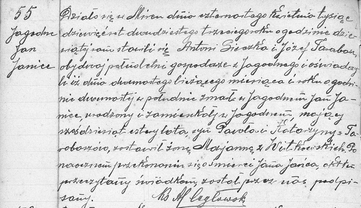 Działo się w Mircu dnia szesnastego Kwietnia tysiąc dziewięćset dwudziestego trzeciego roku o godzinie dziewiątej rano stawili się Antoni Sieczka i Józefa Tarabasz, obydwaj pełnoletni gospodarze z Jagodnego i oświadczyli iż dnia dwunastego bieżącego miesiąca i roku o godzinie dwunastej w południe zmarł w Jagodnem Jan Janiec, urodzony i zamieszkały w Jagodnem, mający sześćdziesiąt cztery lata, syn Pawła i Katarzyny z Tarabaszów, zostawił żonę Marjannę z Witkowskich. Po naocznem przekonaniu się o śmierci Jana Jańca, akt ten przeczytany świadkom został przez nas podpisany.