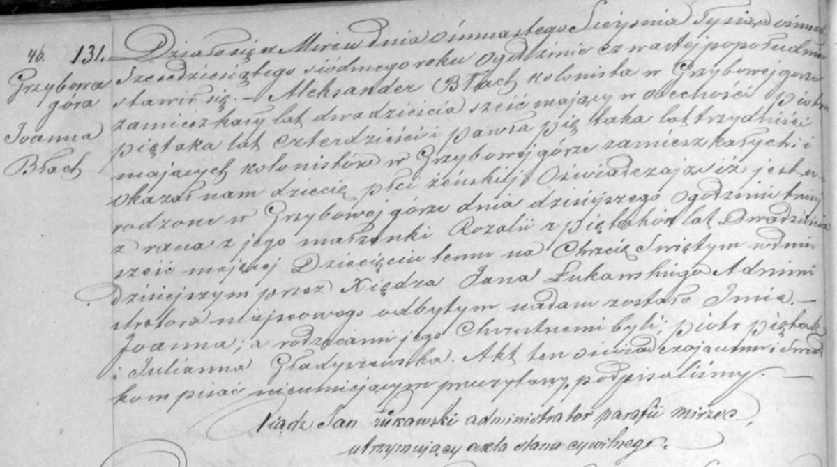 Działo się w Mircu dnia ośmnastego Sierpnia Tysiąc ośmset Sześćdziesiątego siódmego roku o godzinie czwartej popołudniu, stawił się Aleksander Błach kolonista w Grzybowej górze zamieszkały lat dwadzieścia sześć mający w obecności Piotra Piętaka lat czterdzieści i Pawła Piętaka lat trzydzieści mających kolonistów w Grzybowej górze zamieszkałych i okazał nam dziecię płci żeńskiej Oświadczając iż jest urodzone w Grzybowej górze dnia dzisiejszego o godzinie trzeciej z rana z jego małżonki Rozalii z Piętaków lat dwadzieścia sześć mającej. Dziecięciu temu na Chrzcie Świętym wdniu dzisiejszym przez Xiędza Jana Łukawskiego Administratora miejscowego odbytym nadane zostało Imie Joanna; a rodzicami jego chrzestnemi byli: Piotr Piętak i Julianna Gładyszewska. Akt ten oświadczającemu i świadkom pisać nieumiejącym przeczytany, podpisaliśmy.
