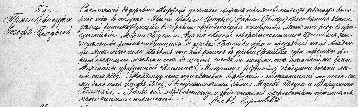 Józef urodził się w dniu 3 kwietnia 1892 r. o godzinie 18:00 w Grzybowej Górze w rodzinie Fabiana Gładysza i Marianny z Piętaków. Został ochrzczony w dniu 10 kwietnia 1892 r. w kościele p.w. św. Leonarda w Mircu. Rodzicami chrzestnymi byli: Marek Płusa i Marianna Piętak.