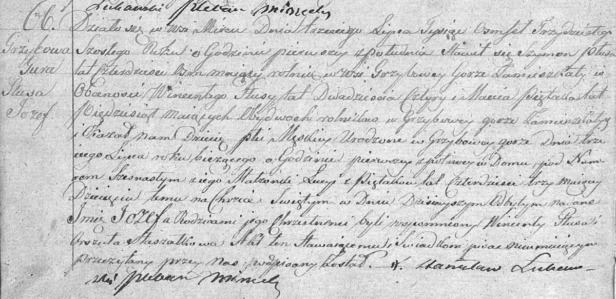 Działo się w wsi Mircu Dnia trzeciego Lipca Tysiąc ośmset Trzydziestego Szóstego Roku o Godzinie pierwszej zpołudnia. Stawił się Szymon Płusa lat czterdzieści ośm maiący rolnik w wsi Grzybowej Górze Zamieszkały w Obecności Wincentego Płusy lat Dwadzieścia Cztyry i Macieia Piętaka lat Pięćdziesiąt Maiących Obydwóch rolników w Grzybowej górze Zamieszkalych i Okazał Nam Dziecię płci męskiej Urodzone w Grzybowej górze Dnia trzeciego Lipca roku bieżącego o Godzinie pierwszej zpółnocy w Domu pod Numerem Szesnastym z iego Małżonki Łucyi z Piętaków lat Czterdzieści trzy Maiącey. Dziecięciu temu na Chrzcie Świętym w Dniu Dzisiejszym Odbytym nadane Imię Józef a Rodzicami jego Chrzestnemi byli wspomniany Wincenty Płusa i Orszula Staszałkowa. Akt ten Stawaiącemu i Świadkom pisać Nieumiejącym Przeczytany przez Nas podpisany Został.