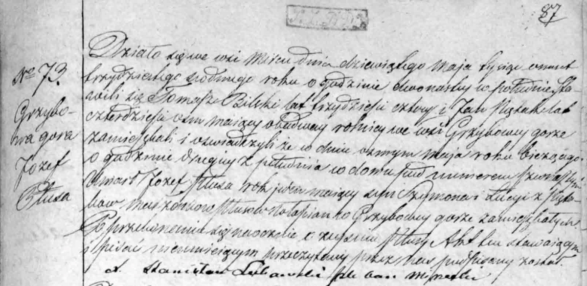 Działo się we wsi Mircu dnia dziewiątego Maja tysiąc ośmset trzydziestego siódmego roku o godzinie dwónastey w południe. Stawili się Tomasz Bilski lat trzydzieści cztery i Jan Piętak lat czterdzieści ośm maiący obadway rolnicy we wsi Grzybowey górze zamieszkali i oświadczyli że w dniu ósmym Maja roku bieżącego o godzinie drugiey z południa w domu pod numerem czwartym umarł Józef Płusa rok jeden maiący syn Szymona i Łucyi z Piętaków Małżonków Płusów włościan w Grzybowey górze zamieszkałych. Po przekonaniu się naocznie o zeyściu Płusy Akt ten stawaiącym i pisać nieumieiącym przeczytany przez nas podpisany został.