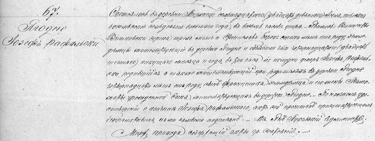Działo się we Wsi Mircu dnia piątego Marca tysiąc osiemset Sześćdziesiątego Czwartego roku, ogodzinie dwunastej w południe. Stawili się – Franciszek Rafalski kolonista w Jagodnem zamieszkały, lat trzydzieści osiem liczący w obecności Gabryela Borka lat dwadzieścia ośm tudzież Pawła Jańca lat trzydzieści cztery mających kolonistów w Jagodnem zamieszkałych i okazał nam dziecię płci Męskiej oświadczając iż takowe urodzone jest w Jagodnem na dniu piątym Marca bieżącego roku o godzinie ósmej z rana z jego Małżonki Małgorzaty z Sieczków lat trzydzieści liczącej. Dziecięciu temu na Chrzcie Świętym wdniu dzisiejszym przez Księdza Jana Łukawskiego Wikaryusza Parafii Mirzec odbytym nadane zostało imie Józef, a Rodzicami jego Chrzestnemi byli Tomasz Sieczka z Gatki i Agnieszka Pogodzińska. Akt ten oświadczającemu i Świadkom pisać nieumiejącym przeczytany a następnie przez nas podpisany został.