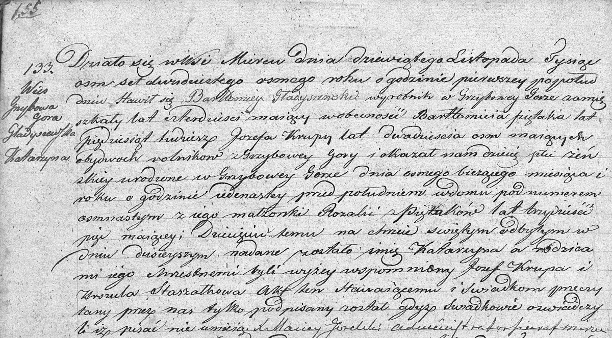 Działo się w Wsi Mircu dnia dziewiątego listopada Tysiąc ośmset dwudziestego ósmego roku o godzinie pierwszej popołudniu stawił się Bartłomiey Gładyszewski wyrobnik w Grzybowej Górze zamieszkały lat czterdzieści mający w obecności Bartłomieia Piętaka lat pięćdziesiąt tudziesz Józefa Krupy lat dwadzieścia ośm maiących obydwuch rolników z Grzybowey Góry i okazał nam dziecię płci żeńskiej urodzone w Grzybowej Górze dnia ósmego bieżącego miesiąca i roku o godzinie iedenastey przed południem wdomu pod numerem ośmnastym z iego małżonki Rozalii z Piętaków lat trzydzieści pięć maiącey; Dziecięciu temu na chrzcie świętym odbytym w dniu dzisiejszym nadane zostało imię Katarzyna a rodzicami iego chrzestnemi byli wyżey wspomniany Józef Krupa i Urszula Staszałkowa. Akt ten stawaiącemu i świadkom przeczytany przez nas tylko podpisany został gdyż świadkowie oświadczyli iż pisać nie umieią.
