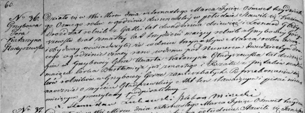 Działo się w Wsi Mircu dnia czternastego Marca Tysiąc Ośmset trzydziestego Ósmego roku ogodzinie dwunastey w południe. Stawili się Kazimierz Drożdżał rolnik z Gatki lat dwadzieścia dziewięć i Leonard Gładyszewski brat zmarłey lat trzydzieści maiący rolnik z Grzybowey Góry i obydway oświadczyli, że w dniu trzynastym Marca roku bieżącego ogodzinie ósmey rano wdomu pod Numerem dwudziestym drugim w Grzybowey Górze Umarła Katarzyna Gładyszewska lat dziesięć maiąca Córka Bartłomieja iuż zmarłego i Rozalii z Piętaków małżonkó rolników w Grzybowey Górze zamieszkałych. Po przekonaniu się naocznie o zeyściu Gładyszewskiej Akt stawaiącym i pisać nieumieiącym przeczytany podpisaliśmy.