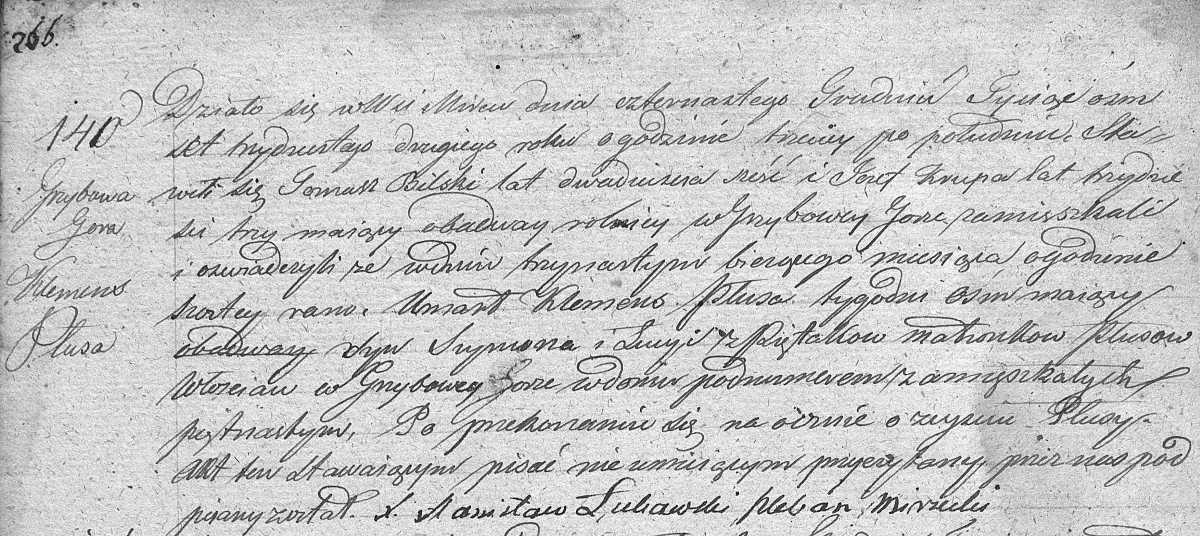 Działo się wWsi Mircu dnia czternastego Grudnia Tysiąc ośmset trzydziestego drugiego roku o godzinie trzeciey po południu. Stawili się Tomasz Bilski lat dwadzieścia sześć i Józef Krupa lat trzydzieści trzy maiący obydway rolnicy w Grzybowey Górze zamieszkali i oświadczyli że w dniu trzynastym bieżącego miesiąca ogodzinie szóstey rano. Umarł Klemens Płusa tygodni ośm maiący syn Szymona i Łucyi z Piętaków małżonków Płusów włościan w Grzybowej Górze wdomu podnumerem zamieszkałych piętanastym. Po przekonaniu się naocznie o zeyściu Płusy. Akt ten stawaiącym pisać nieumieiącym przeczytany, przez nas podpisany został.