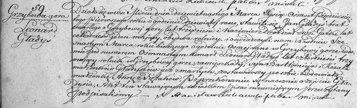 Działo się wwsi Mircu dnia dziewiętnastego Marca tysiąc ośmset pięćdziesiątego pierwszego roku o godzinie dziewiątej rano. Stawili się Jan Gładyś brat zmarłego z Grzybowej góry lat trzydzieści i Kazimierz Drożdżał zwsi Gatki lat czterdzieści jeden mający, obydwa rolnicy i oświadczyli nam iż wdniu Szesnastym Marca roku bieżącego o godzinie ósmej rano w Grzybowej górze wdomu pod numerem ośmnastym umarł Leonard Gładyś lat czterdzieści trzy mający rolnik w Grzybowej górze zamieszkały, syn Bartłomieja i Rozalii małżonków Gładysiów już zmarłych, zostawiwszy posobie owdowiałą małżonkę Annę z Piętaków. Poprzekonaniu się naocznie o zejściu Gładysia, Akt ten stawającym świadkom pisać nieumiejącym przeczytany podpisaliśmy.