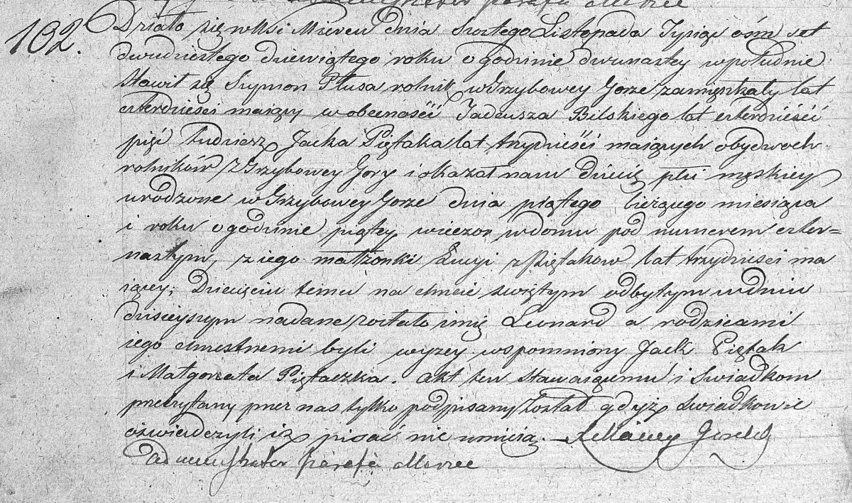 Działo się wwsi Mircu dnia Szóstego Listopada Tysiąc ośm set dwudziestegodziewiątego roku o godzinie dwunastey wpołudnie. Stawił się Szymon Płusa rolnik w Grzybowey Górze zamieszkały lat czterdzieści maiący wobecności Tadeusza Bilskiego lat czterdzieści pięć tudzież Jacka Piętaka lat trzydzieści maiących obydwóch rolników z Grzybowey Góry i okazał nam dziecię płci męskiey urodzone w Grzybowej Górze dnia piątego bieżącego miesiąca i roku o godzinie piątey wieczór wdomu pod numerem czternastym, z iego małżonki Łucyi z Piętaków lat trzydzieści maiącey. Dziecięciu temu na chrzcie świętym odbytym wdniu dzisiejszym nadane zostało imię Leonard a rodzicami iego chrzestnemi byli wyżey wspomniany Jacek Piętak i Małgorzata Piętaczka. Akt ten stawaiącemu i świadkom przeczytany przez nas tylko podpisany został gdyż świadkowie oświadczyli iż pisać nie umieją.