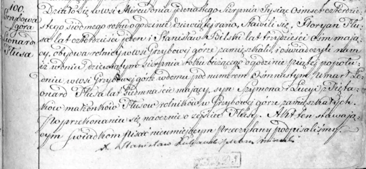 Działo się wWsi Mircu dnia jedenastego Sierpnia Tysiąc ośmset czterdziestego siódmego roku o godzinie dziewiątej rano, Stawili się Florian Płusa lat czterdzieści jeden i Stanisław Bilski lat trzydzieści ośm mający, obydwa rolnicy wWsi Grzybowej górze zamieszkali, i oświadczyli nam iż w dniu dziewiątym sierpnia roku bieżącego o godzinie piątej popołudniu wWsi Grzybowej górze wdomu pod numerem ośmnastym umarł Leonard Płusa lat siedmnaście mający, syn Szymona i Łucyi z Piętaków małżonków Płusów rolników w Grzybowej górze zamieszkałych. Po przekonaniu się naocznie o zejściu Płusy. Akt ten stawającym świadkom pisać nieumiejącym przeczytany podpisaliśmy.
