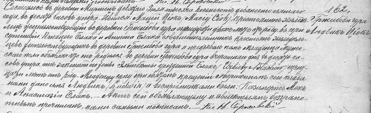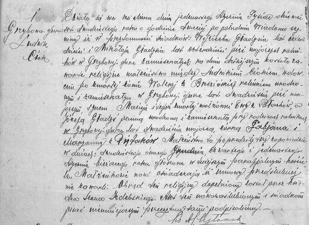Działo się we wsi Mircu dnia jedenastego stycznia tysiąc dziewięćset dwudziestego roku o godzinie trzeciej po południu. Wiadomo czynimy iż w przytomności świadków: Wojciecha Gładysia lat czterdzieści i Mikołaja Gładysia lat czterdzieści pięć mających rolników w Grzybowej-gurze zamieszkałych; na dniu dzisiejszym zostało zawarte religijne małżeństwo między Ludwikiem Ciokiem wdowcem po zmarłej żonie Waleryi z Brzezińskich rolnikiem urodzonym i zamieszkałym w Grzybowej Górze lat dwadzieścia pięć mającym, synem Macieja i tegoż zmarłej małżonki Ewy z Błachów, a Józefą Gładyś panną urodzoną i zamieszkałą przy rodzicach rolnikach w Grzybowej-gurze lat dwadzieścia mającą, córką Fabjana i Maryanny z Piętaków. Małżeństwo to poprzedziły trzy zapowiedzi w dniach: dwudziestego ósmego grudnia, czwartego i jedenastego stycznia bieżącego roku głoszone w tutejszym parafialnym kościele. Małżonkowie Nowi oświadczają iż umowy przedślubnej nie zawarli. Obrzęd ten religijny dopełniony został przez księdza Leona Izdebskiego. Akt ten nowozaślubionym i świadkom pisać nieumiejącym przeczytany sami podpisaliśmy.