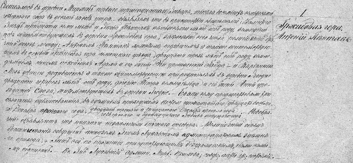 Działo się wWsi Mircu dnia dziesiątego Marca Tysiąc Ośmset Pięćdziesiątego roku o godzinie dwunastej wpołudnie, stawił się Piotr Mech lat trzydzieści siedm mający rolnik wWsi Jagodnem zamieszkały, wprzytomności Jakóba Szarana lat dwadzieścia trzy i Pawła Sieczki lat sześćdziesiąt dziewięć mających, obydwóch rolników wWsi Jagodnem zamieszkałych, i okazał nam dziecię płci Żeńskiej, urodzone w Jagodnem wdomu pod numerem szóstym dnia dziewiątego Marca o godzinie jedenastej przed południem z jego małżonki Anny z Sadzów lat trzydzieści mającej. Dziecięciu temu na chrzcie świętym dziś odbytym nadano imię Maryanna, a rodzicami jego chrzestnemi byli: wyżej wspomniany Jakób Szaran i Giertruda Derlatczyna. Akt ten stawającemu i świadkom pisać nieumiejącym przeczytany podpisaliśmy.