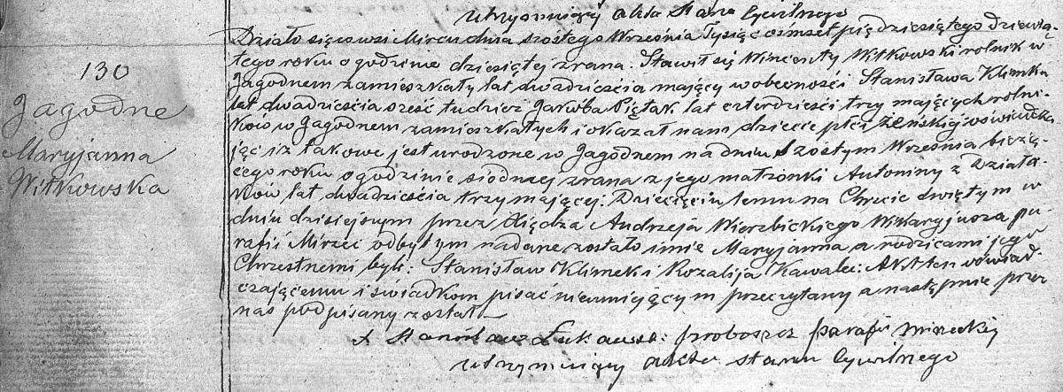 Działo się w wsi Mircu dnia szóstego Września Tysiąc ośmset pięćdziesiątego dziewiątego roku o godzinie dziesiątej zrana. Stawił się Wincenty Witkowski rolnik w Jagodnem zamieszkały lat dwadzieścia mający w obecności Stanisława Klimka lat dwadzieścia sześć tudzież Jakóba Piętak lat czterdzieści trzy mających rolników w Jagodnem zamieszkałych i okazał nam dziecię płci żeńskiej oświadczając iż takowe jest urodzone w Jagodnem na dniu szóstym Września bieżącego roku o godzinie siódmej zrana z jego małżonki Antoniny z Działaków lat dwadzieścia trzy mającej. Dziecięciu temu na Chrzcie świętym w dniu dzisiejszym przez Księdza Andrzeja Wierzbickiego Wikaryjusza parafii Mirzec odbytym nadane zostało imie Maryjanna a rodzicami jego Chrzestnemi byli: Stanisław Klimek i Rozalija Kawalec. Akt ten oświadczającemu i świadkom pisać nieumiejącym przeczytany a następnie przez nas podpisany został.