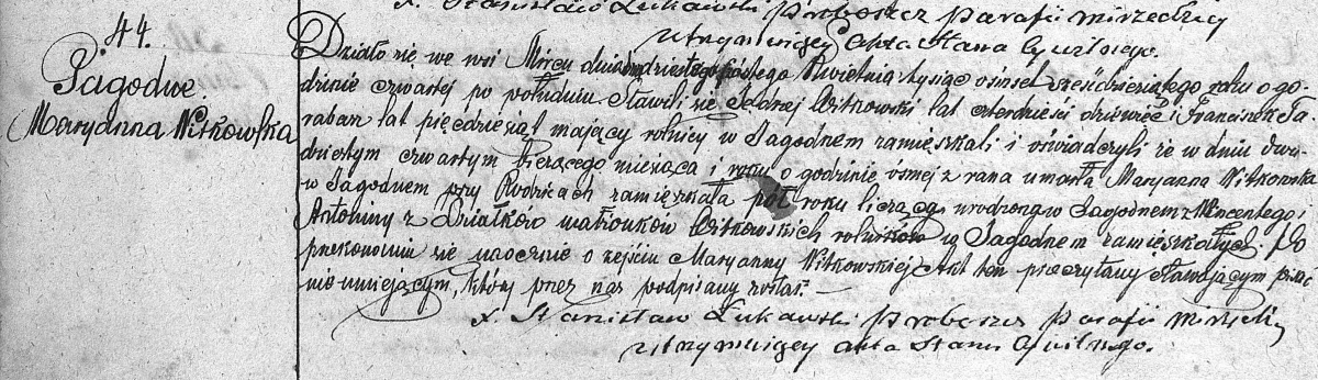 Działo się we wsi Mircu dwudziestego piątego Kwietnia tysiąc ośmset sześćdziesiątego roku o godzinie czwartej po południu. Stawili się Jędrzej Witkowski lat czterdzieści dziewięć i Franciszek Tarabasz lat pięćdziesiąt mający rolnicy w Jagodnem zamieszkali i oświadczyli że w dniu dwudziestym czwartym bieżącego miesiąca i roku o godzinie ósmej z rana umarła Maryanna Witkowska w Jagodnem przy Rodzicach zamieszkała pół roku licząca, urodzona w Jagodnem z Wincentego i Antoniny z Działaków małżonków Witkowskich rolników w Jagodnem zamieszkałych. Po przekonaniu się naocznie o zejściu Maryanny Witkowskiej Akt ten przeczytany stawającym pisać nie umiejącym, który przez nas podpisany został.