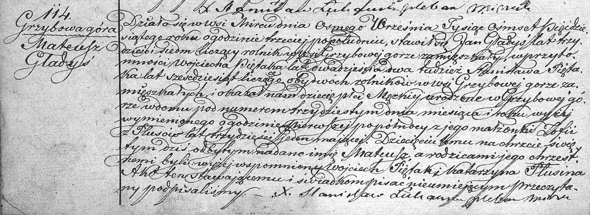 Działo się wwsi Mircu dnia ósmego Września Tysiąc ośmset pięćdziesiątego roku o godzinie trzeciej po południu. Stawił się Jan Głądyś lat trzydzieści siedm liczący rolnik wwsi Grzybowej górze zamieszkały, wprzytomności Wojciecha Piętaka lat dwadzieścia dwa tudzież Stanisława Piętaka lat sześćdziesiąt liczącego, obydwóch rolników wwsi Grzybowej góze zamieszkałych, i okazał nam dziecię płci Męskiej urodzone w Grzybowej górze wdomu pod numerem trzydziestym dnia miesiąca i roku wyżej wymienionego o godzinie pierwszej popółnocy z jego małżonki Zofii z Płusów lat trzydzieści jeden mającej. Dziecięciu temu na chrzcie świętym dziś odbytym nadano imię Mateusz a rodzicami chrzestnemi byli wyżej wspomnany Wojciech Piętak i Katarzyna Płusina. Akt ten stawającemu i świadkom pisać nieumiejącym przeczytany podpisaliśmy.