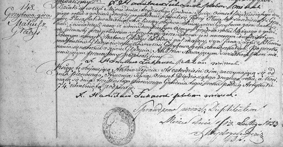 Działo się wwsi Mircu dnia trzydziestego Grudnia Tysiąc ośmset pięćdziesiątego drugiego roku o godzinie drugiej po południu stawili się Jędrzej Płusa lat sześćdziesiąt i Grzegorz Płusa lat dwadzieścia sześć liczący obydwa rolnicy wwsi Grzybowa Góra zamieszkali, i oświadczyli nam i wdniu dwudziestym ósmym Grudnia roku bieżącego o godzinie jedenastej przed południem w Grzybowej górze wdomu pod numerem dwudziestym siódmym umarł Mateusz Gładyś lat dwa i pół mający, syn Jana i Zofii z Płusów małżonków Gładysiów rolników wwsi Grzybowa góra zamieszkałych. Po przekonaniu się naocznie o zejściu Gładysia, Akt ten stawającym świadkom pisać nieumiejącym przeczytany podpisaliśmy.