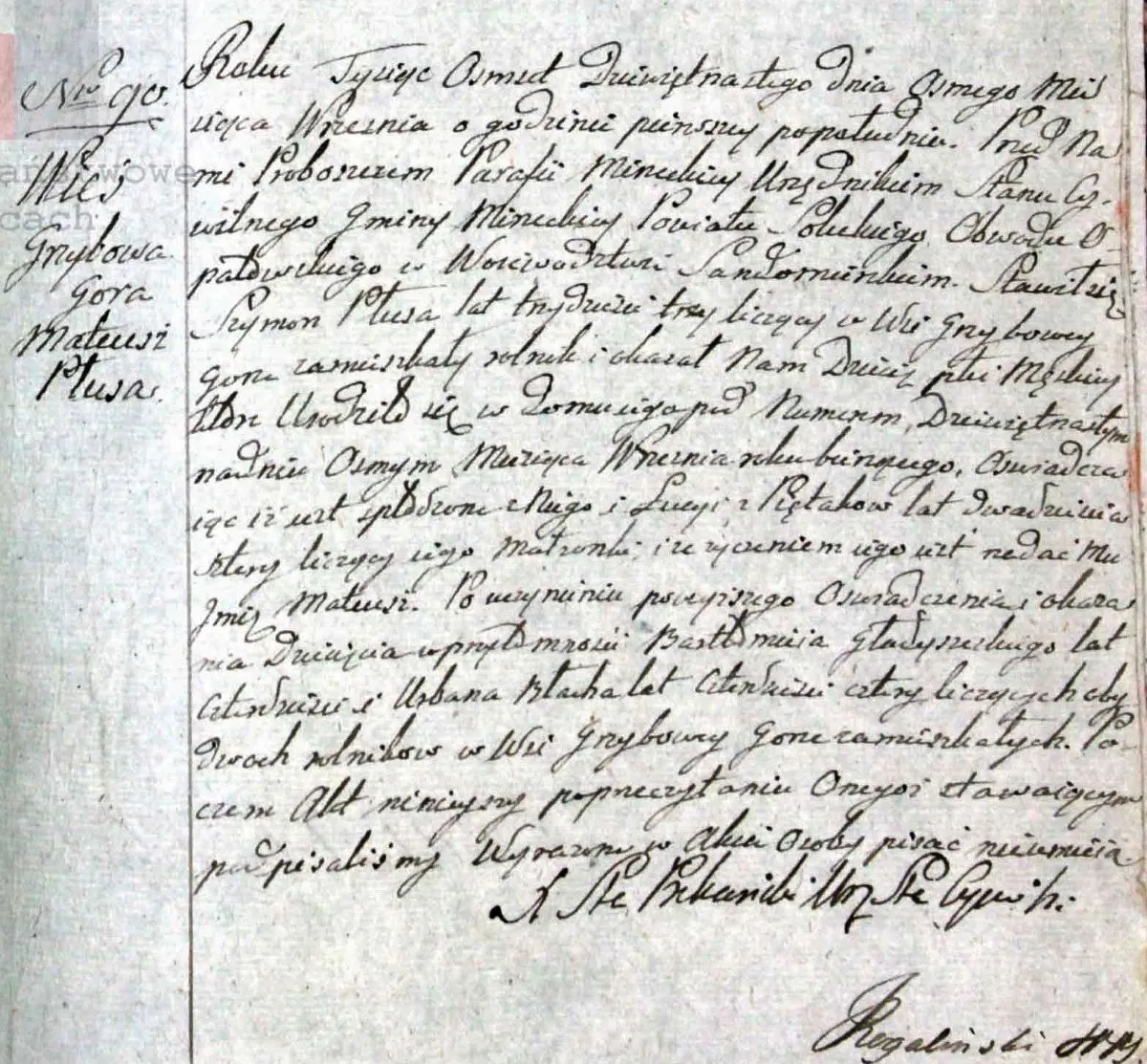 Roku Tysiąc Ośmset Dziewiętnastego dnia Ósmego Miesiąca Września o godzinie pierwszey po południu. Przed Nami Proboszczem Parafii Mirzeckiey Urzędnikiem Stanu Cywilnego Gminy MIrzeckiey Powiatu Soleckiego Obwodu Opatkowskiego w Woiewództwie Sandomierskiem. Stawił się Szymon Płusa lat trzydzieści trzy liczący w Wsi Grzybowey Górze zamieszkały rolnik i okazał Nam Dziecię płci Męskiey które urodziło się nadniu Ósmym Miesiąca Września roku bieżącego, Oświadczaiąc iż jest spłodzone z Niego i Łucyi z Piętaków lat dwadzieścia cztery liczącey iego Małżonki i że życzeniem iego jest nadać Mu Imię Mateusz. Po uczynieniu powyższego Oświadczenia i okazania Dziecięcia wprzytomności Bartłomieia Gładyszewskiego lat czterdzieści i Urbana Błacha lat czterdzieści cztery liczących obydwóch rolników w Wsi Grzybowey Górze zamieszkałych. Poczem Akt niniejszy poprzeczytaniu Onegoż stawaiącym podpisaliśmy. Wyrażona w Akcie osoby pisać nieumieią.