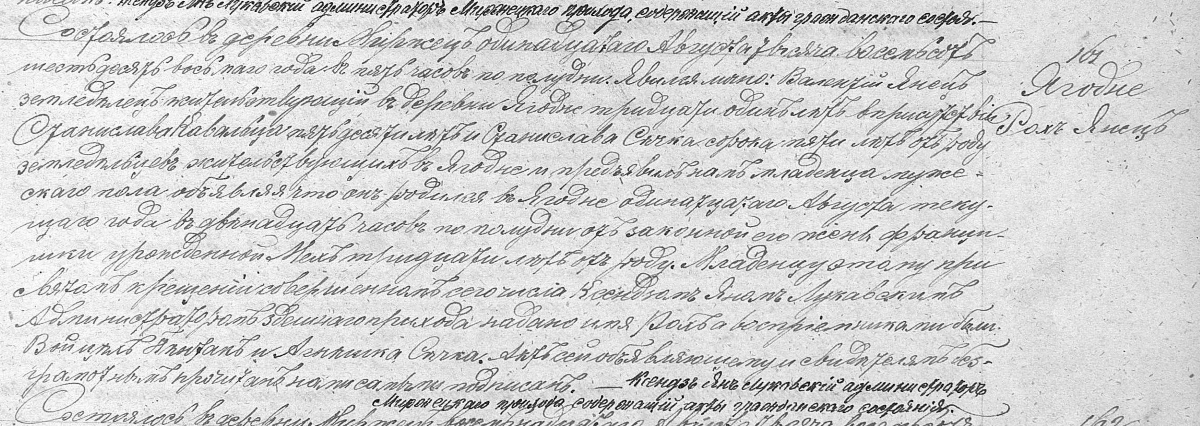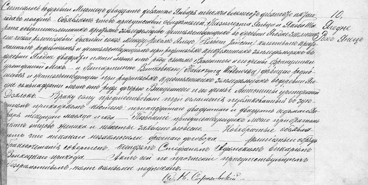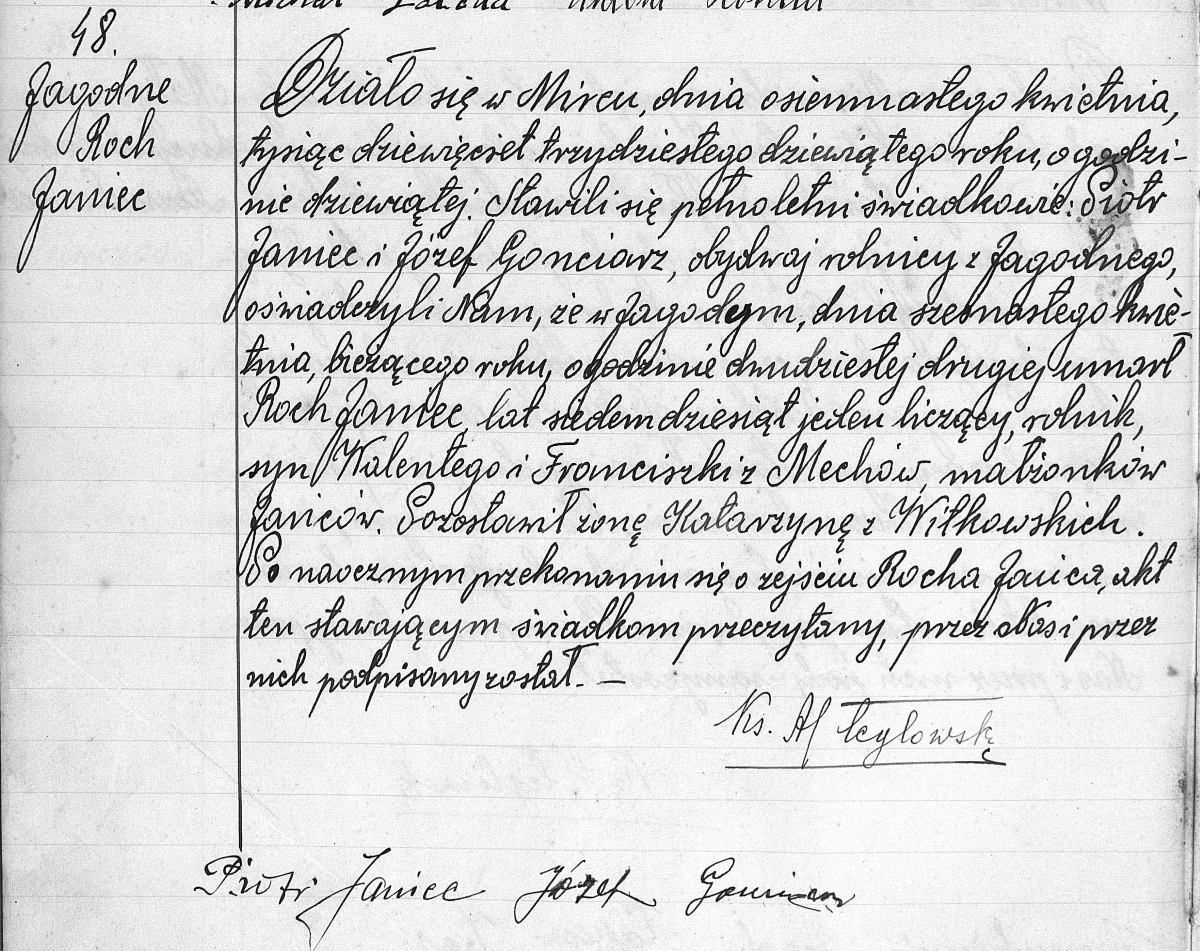 Działo się w Mircu dnia osiemnastego kwietnia, tysiąc dziewięćset trzydziestego dziewiątego roku, o godzinie dziewiątej. Stawili się pełnoletni świadkowie: Piotr Janiec i Józef Gonciarz, obydwaj rolnicy z Jagodnego, oświadczyli Nam, że w Jagodnym, dnia szesnastego kwietnia, bieżącego roku, o godzinie dwudziestej drugiej umarł Roch Janiec lat siedemdziesiąt jeden liczący, rolnik, syn Walentego i Franciszki z Mechów, małżonków Jańców. Pozostawił żonę Katarzynę z Witkowskich. Po naocznym przekonaniu się o zejściu Rocha Jańca, akt ten stawającym świadkom przeczytany, przez Nas i przez nich podpisany został.