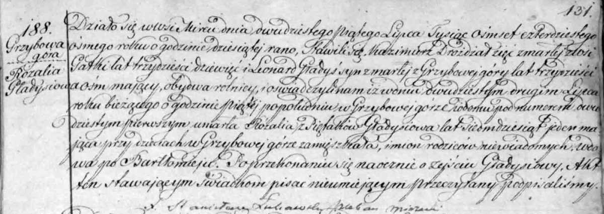 Działo się wWsi Mircu dnia dwudziestego piątego Lipca Tysiąc ośmset czterdziestego ósmego roku o godzinie dziesiątej rano. Stawili się Kazimierz Drożdżał zięć zmarłej zWsi Gatki lat trzydzieści dziewięć i Leonard Gładyś syn zmarłej z Grzybowej góry lat trzydzieści ośm mający, obydwa rolnicy, i oświadczyli nam iż wdniu dwudziestym drugim Lipca roku bieżącego o godzinie piątej popołudniu w Grzybowej górze wdomu pod numerem dwudziestym pierwszym umarła Rozalia z Piętaków Gładysiowa lat siedmdziesiąt jeden mająca przy dzieciach w Grzybowej górze zamieszkała, imion rodziców niewiadomych, wdowa po Bartłomieju. Poprzekonaniu się naocznie o zejściu Gładysiowej, Akt ten stawającym świadkom pisać nieumiejącym przeczytany odpisaliśmy.