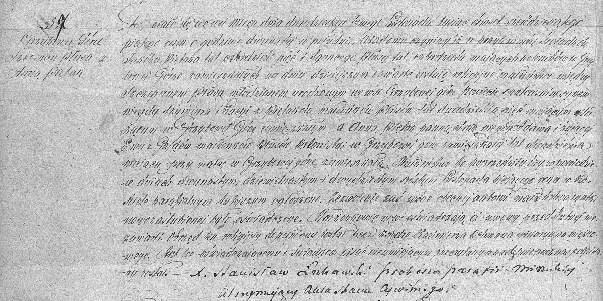 Działo się we wsi Mircu dnia dwudziestego ósmego Listopada tysiąc ośmset sześćdziesiątego piątego roku o godzinie dwunastej w południe. Wiadomo czynimy iż w przytomności świadków Jakóba Piętaka lat czterdzieści pięć i Ignacego Płusy lat czterdzieści mających rolników w Grzybowej Górze zamieszkałych na dniu dzisiejszym zawarte zostało religijne małżeństwo między Szczepanem Płusa młodzianem urodzonym we wsi Grzybowej górze powiecie opatowskim synem niegdy Szymona i Łucyi z Piętaków małżonków Płusów lat dwadzieścia pięć mającym służącym w Grzybowej Góze zamieszkałym, a Anną Piętak panną córką niegdy Adama i żyjącej Ewy z Gajdów małżonków Płusów kolonistki w Grzybowej górze zamieszkałej lat dwadzieścia mającą przy matce w Grzybowej górze zamieszkałą. Małżeństwo to poprzedziły trzy zapowiedzie w dniach dwunastym, dziewietnastym i dwudziestym szóstym Listopada bieżącego roku w Kościele parafialnym tutejszym ogłoszone. Zezwolenie zaś ustne obecnej aktowi małżeństwa matki nowozaślubionej było oświadczone. Małżonkowie nowi oświadczają iż umowy przedślubnej nie zawarli. Obrzęd ten religijny dopełniony został przez Księdza Kazimierza Ochmana wikaryusza miejscowego. Akt ten oświadczającemu i świadkom pisać nieumiejącym przeczytany a następnie przez nas podpisany został.