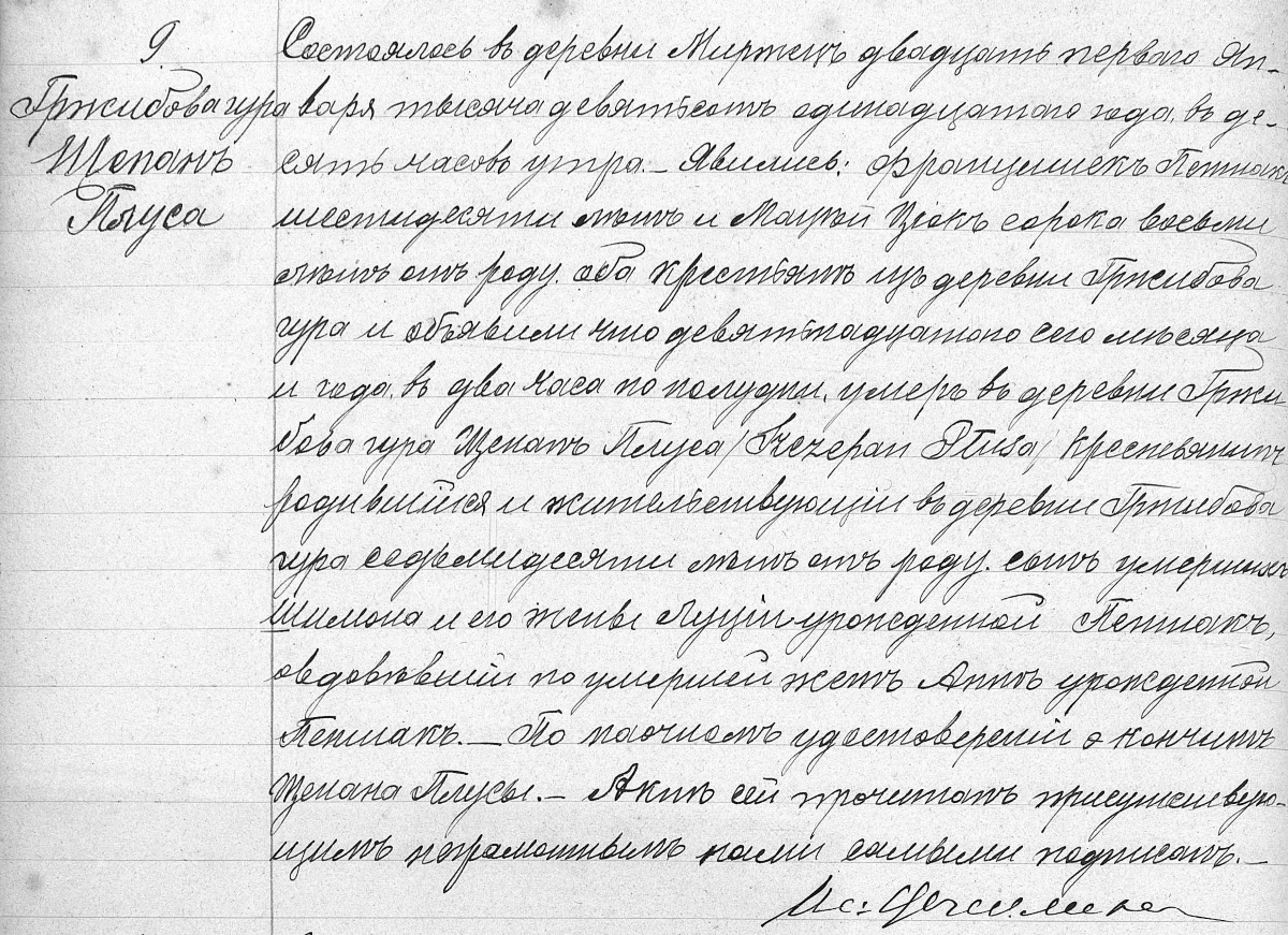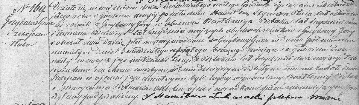 Działo się w wsi Mircu dnia dwudziestego szóstego Grudnia Tysiąc ośmset czterdziestego roku o godzinie drugiej po południu. Stawił się Szymon Płusa lat czterdzieści rolnik z Grzybowej Góry w obecności Bartłomieja Piętaka lat trzydzieści ośm i Tomasza Bielskiego lat trzydzieści mających obydwóch rolników z Grzybowej Góry i okazał nam dziecię płci męskiej urodzone w Grzybowej Górze w domu pod numerem szesnastymw dnia dwudziestego piątego bieżącego miesiąca o godzinie dwunastej w nocy z jego małżonki Łucyi z Piętaków lat trzydzieści dwa mającej. Dziecięciu temu na chrzcie świętym w dniu dzisiejszym odbytym nadane zostało imie Szczepan a ojcami jego chrzestnymi byli wyżej wymieniony Bartłomiej Piętak i Maryanna Piętaczka. Akt ten ojcu i świadkom pisać nieumiejącym przeczytany podpisaliśmy.