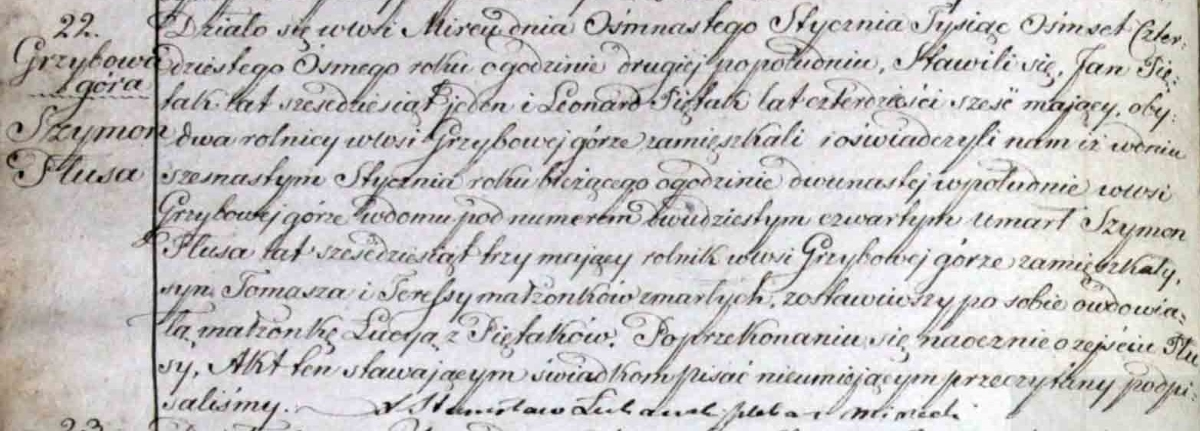Działo się wwsi Mircu dnia Ośmnastego Stycznia Tysiąc Ośmset Czterdziestego Ósmego roku ogodzinie drugiej popołudniu. Stawili się Jan Piętak lat sześćdziesiąt jeden i Leonard Piętak lat czterdzieści sześć mający, obydwa rolnicy wwsi Grzybowej górze zamieszkali i oświadczyli nam iż wdniu szesnastym Stycznia roku bieżącego ogodzinie dwunastej wpołudnie wwsi Grzybowej górze wdomu pod numerem dwudziestym czwartym umarł Szymon Płusa lat sześćdziesiąt trzy mający rolnik wwsi Grzybowej górze zamieszkały, syn Tomasza i Teresy małżonków zmarłych. zostawiwszy po sobie owdowiałą małżonkę Łucya z Piętaków. Poprzekonaniu się naocznie o zejściu Płusy, Akt ten stawającym świadkom pisać nieumiejącym przeczytany podpisaliśmy.