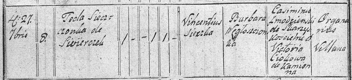 Tekla urodziła się w dniu 27 września 1809 r. w miejscowości Świerczek w rodzinie Wincentego Sieczki i Barbary z Węgłowskich. Została ochrzczona w kościele p.w. św. Trójcy w Skarżysku Kościelnym.