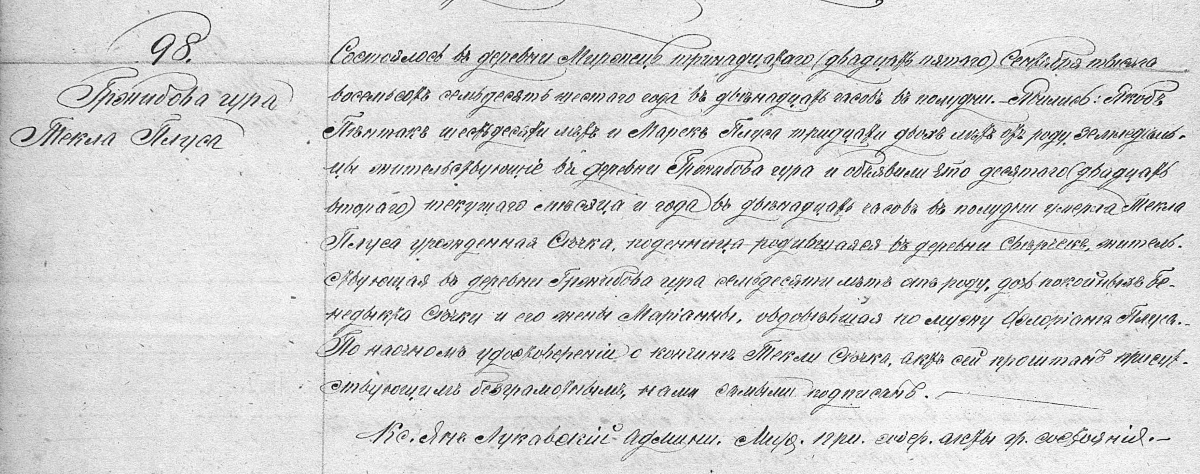 Działo się w Skarżysku Kościelnem dnia dwudziestego trzeciego Stycznia tysiąc ośmset dwudziestego szóstego roku o godzinie drugiej po południu. Wiadomo czynimy iż w przytomności świadków Jana Piętaka lat trzydzieści i Mateusza Płusy stryia niżej wymienionego Floriana Płusy lat pięćdziesiąt maiących obydwóch rolników w wsi Grzybowey Górze zamieszkałych, na dniu dzisieyszym zawarte zostało religiyne małżeństwo między Floryanem Płusą młodzianem rolnikiem w Grzybowey Górze zamieszkałym urodzonym w Grzybowey Górze z Jana i Teresy z Zapalskich małżonków Płusów w teyże wsi Grzybowey Górze zamieszkałych, lat dwadzieścia trzy maiącym, a panną córką Wincentego i Barbary małżonków Sieczków w Świerczku zamieszkałych lat ośmnaście liczącą w Świerczku zrodzoną i przy rodzicach zostaiącą. Małżeństwo to poprzedziły trzy zapowiedzi w dniach: ósmym, pietnastym i dwudziestym drugim Stycznia roku bieżącego w Parafii Skarżyskiej iako też zezwolenie ustne obecnych Aktowi Małżeństwa rodziców oboyga nowo zaślubionych było oświadczone. Tamowanie Małżeństwa nie zaszło. Małżonkowie nowi oświadczają iż nie zawarli umowy przedślubney. Akt ten stawaiącym i świadkom przeczytany podpisany został przez nas, gdyż w Akcie wyrażone osoby pisać nie umieią.
