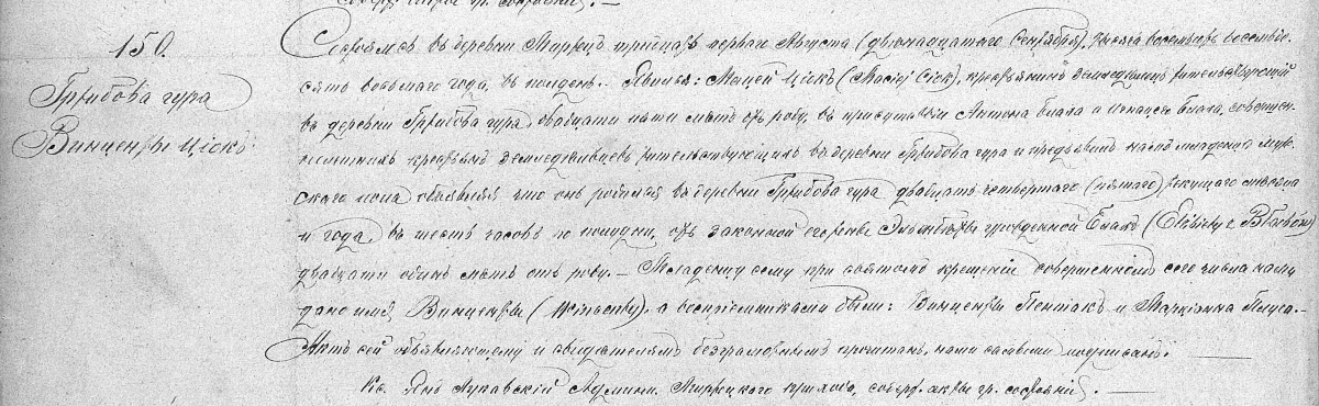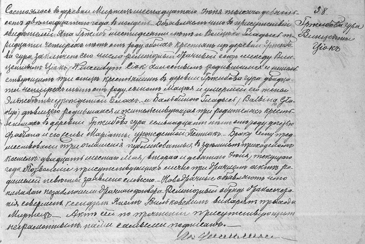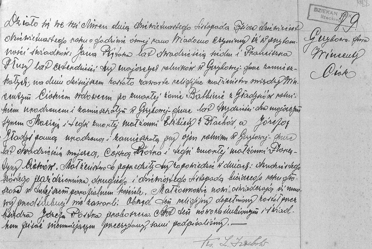 Działo się we wsi Mircu dnia dziewiętnastego listopada tysiąc dziewięćset dziewiętnastego roku o godzinie ósmej rano. Wiadomo czynimy iż w przytomności świadków: Jana Piętaka lat dwadzieścia siedem i Franciszka Płusy lat czterdzieści trzy mających rolników w Grzybowej Górze zamieszkałych, na dniu dzisiejszym zostało zawarte religijne małżeństwo między Wincentym Ciokiem wdowcem po zmarłej żonie Balbinie z Gładysiów rolnikiem urodzonem i zamieszkałym w Grzybowej Górze lat trzydzieści dwa mającym synem Macieja i tegoż zmarłej małżonki Bilskiego z Błachów a Józefą Gładyś panną urodzoną i zamieszkałą przy ojcu rolniku w Grzybowej Górze lat dwadzieścia mającą, córką Piotra i tegoż zmarłej małżonki Florentyny z Cioków. Małżeństwo to poprzedziły trzy zapowiedzi w dniach: dwudziestego szóstego października, drugiego i dziewiątego listopada bieżącego roku ogłoszene w tutejszym parafialnym kościele. Małżonkowie nowi oświadczają iż umowy przedślubnej nie zawarli. Obrzęd ten religijny dopełniony został przez księdza Józefa Postka proboszcza, Akt ten nowozaślubionym i świadkom pisać nieumiejącym przeczytany, sami podpisaliśmy.