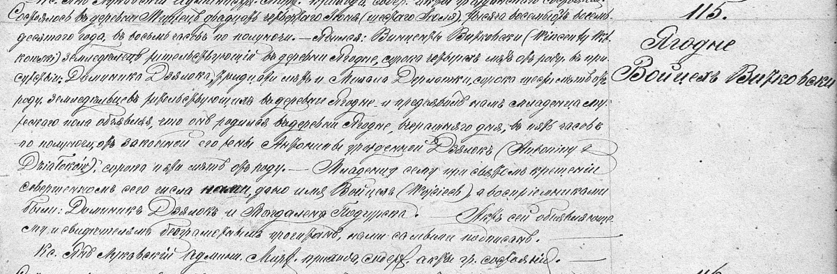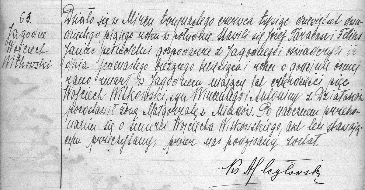 Działo się w Mircu trzynastego czerwca tysiąc dziewięćset dwudziestego piątego roku w południe. Stawili się Józef Tarabasz i Feliks Janiec pełnoletni gospodarze z Jagodnego i oświadczyli iż dnia jedenastego bieżącego miesiąca i roku o godzinie ósmej rano zmarł w Jagodnem mający lat czterdzieści pięć Wojciech Witkowski, syn Wincentego i Antoniny z Działaków, pozostawił żonę Małgorzatę z Mindów. Po naocznem przekonaniu się o śmierci Wojciecha Witkowskiego, akt ten stawającym przeczytany, przez nas podpisany został.